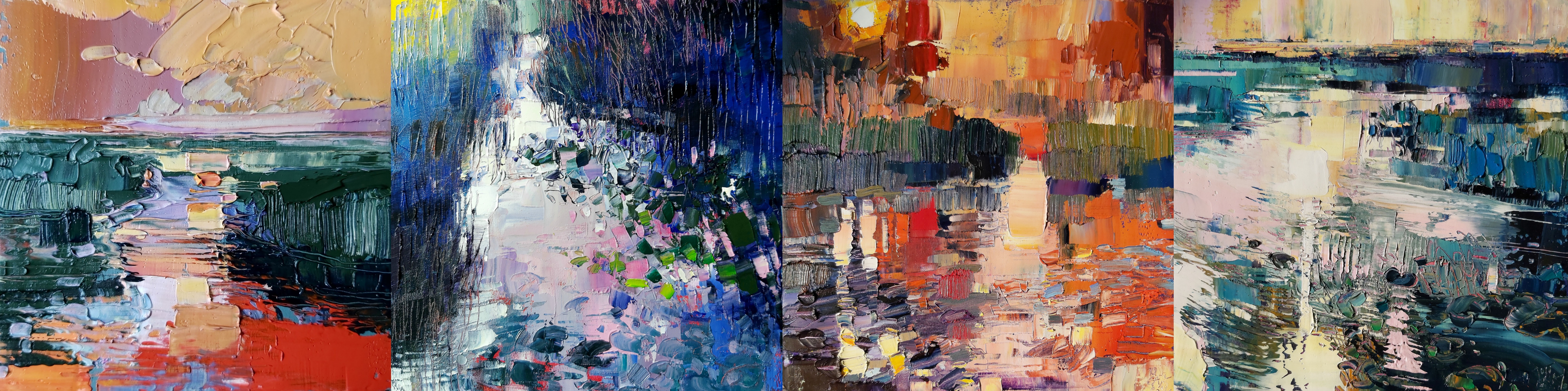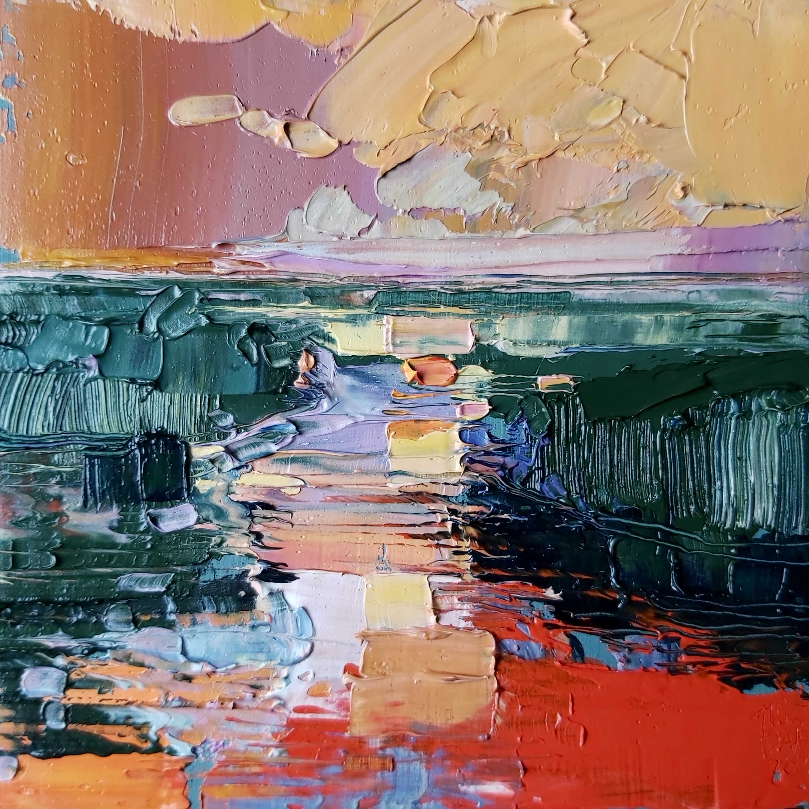 Ik werk in de alla prima techniek, waarbij ik schilder op een gekleurde ondergrond. Elke beweging met het mes moet kloppen – er is geen ruimte voor eindeloos bijwerken. Dit vraagt intuïtie en moed. Het mes sleept de verf over het doek, creëert dikke texturen, mengt kleuren direct op het canvas. Wat ontstaat is geen afbeelding van een landschap, maar een ervaring van licht, ruimte en atmosfeer.