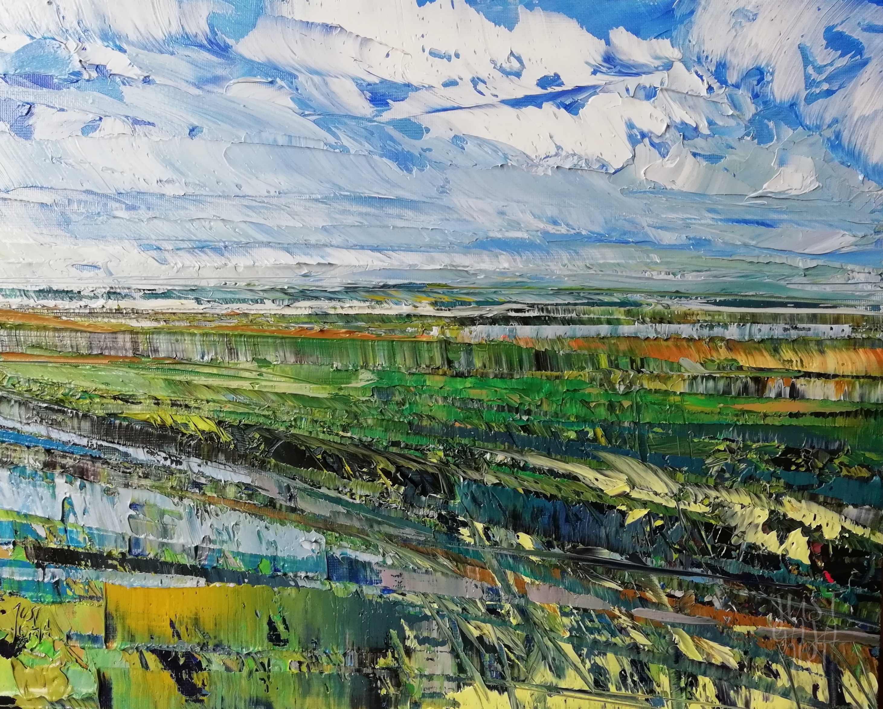 Als je door een Nederlands polderlandschap rijdt, word je overspoeld door een gevoel van oneindige ruimte. Die eindeloze horizon, de weidsheid van de lucht, het spel van licht op water en de subtiele kleurverschuivingen in de verte – het zijn juist deze elementen die mij verleid hebben om de stap te zetten naar abstract landschap schilderen.